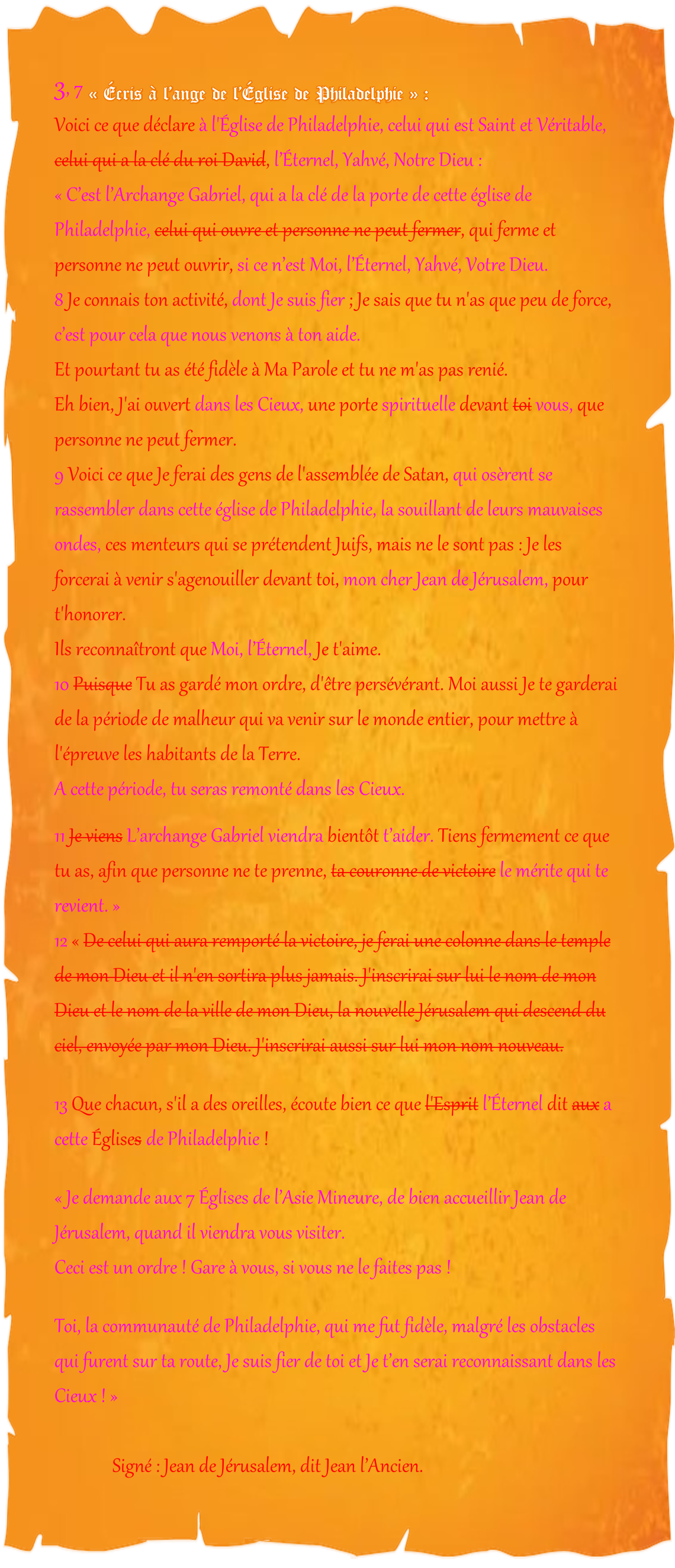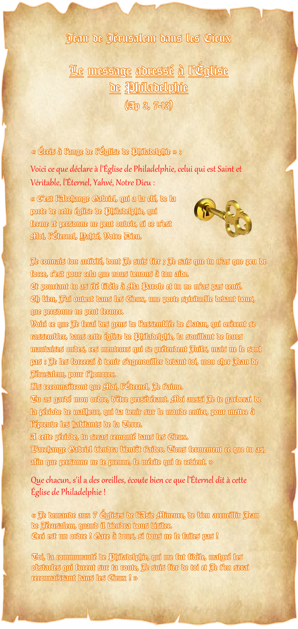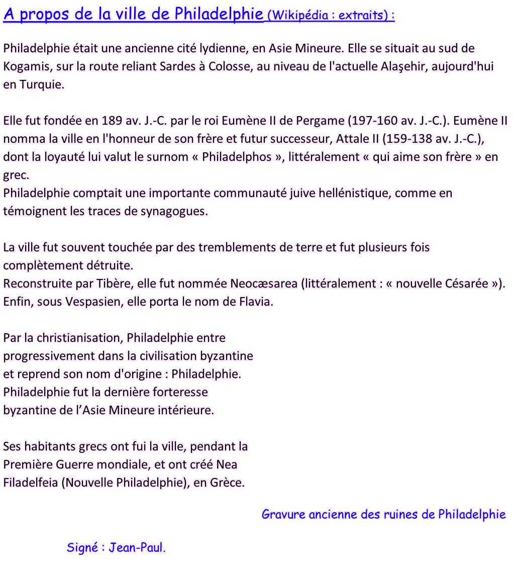 Le message adressé à l’Église de Philadelphie (Ap 3, 7-13) Messages canalisés par Françoise-Rose,    le 21 Juin 2022. Signé : l’Éternel, Yahvé, Votre Dieu, et Jean de Jérusalem, dit Jean l’Ancien. << Retour à la page « Jean l’Ancien (Lettres) »