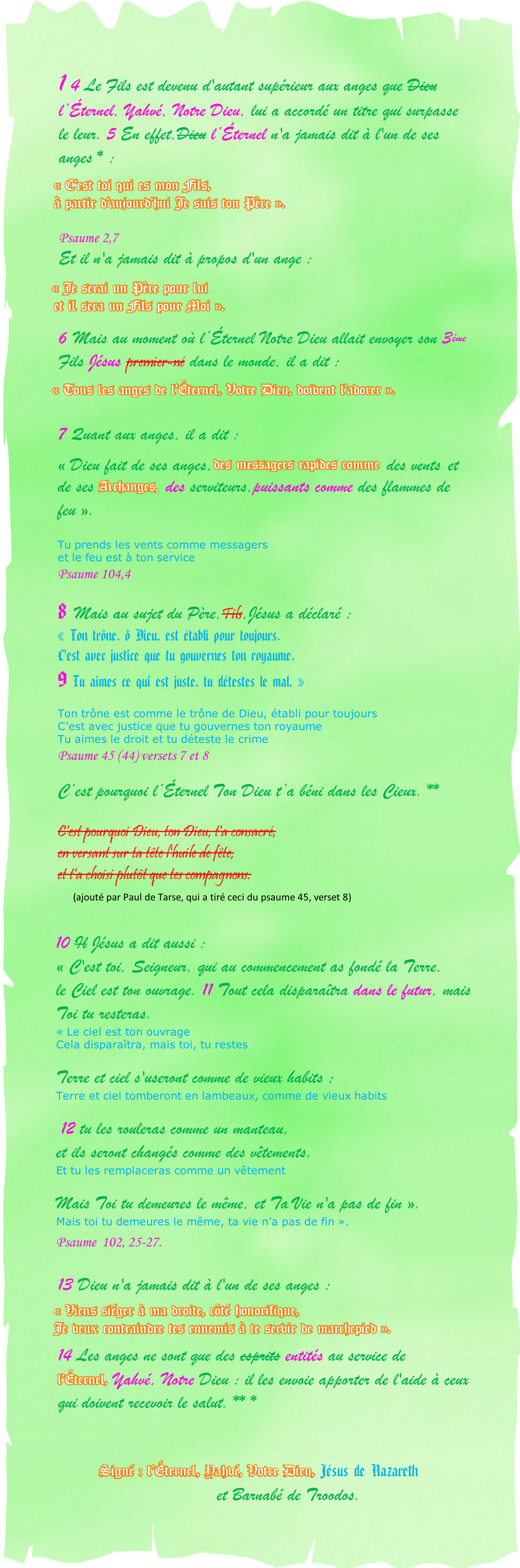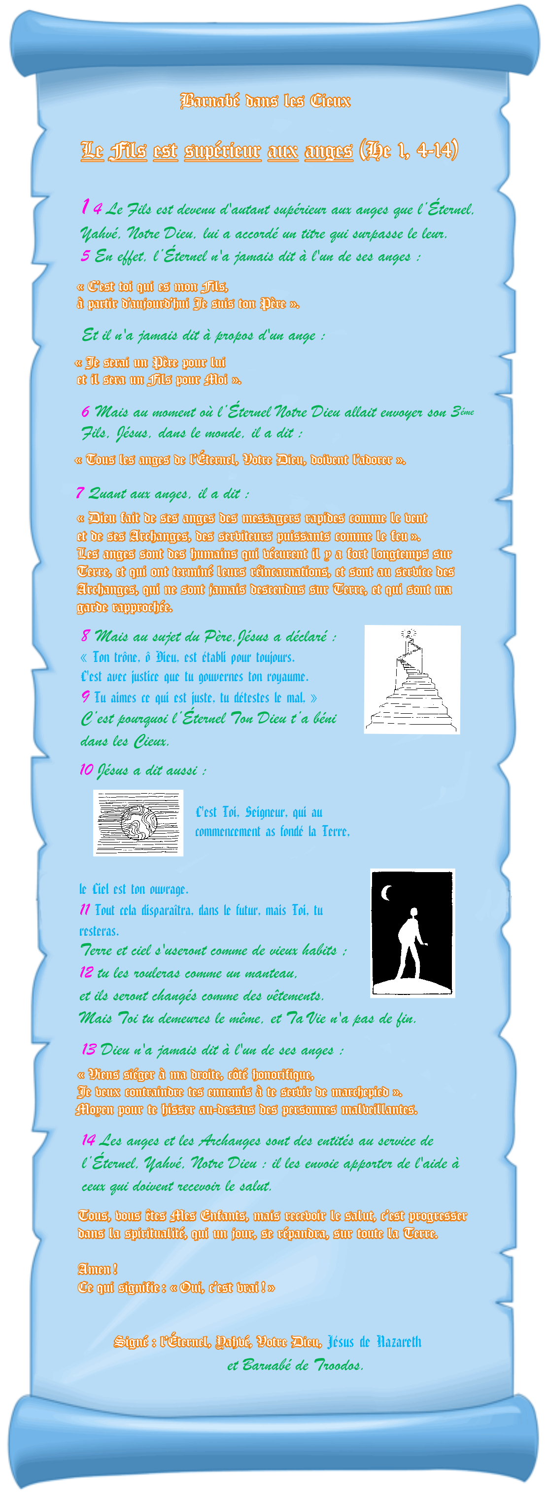 Le Fils est supérieur aux anges Lettres aux Hébreux (He 1, 4-14) Barnabé s’est servi des psaumes. Je veux que l’on voie la vraie traduction, ce qui fera plaisir, J’en suis sûr, aux amoureux des psaumes.              Signé : l’Éternel, Yahvé, Votre Dieu. Illustration de Jean-François Kieffer (1000 images d’évangile). Messages canalisés par Françoise-Rose,    du 6 au 12 Juillet 2021. << Retour à la page « Barnabé de Troodos » Illustrations de Patrick Royer (1000 images symboliques).